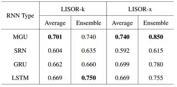表 3:分别基于 LISOR-k 和 LISOR-x 方法,当从 4 个 RNNzho 中学习到的 FSA 在任务「000」的准确率首次达到 0.7 时,集群的数量(n_c)。注意这些值是越小越高效,并且可解释性越好。