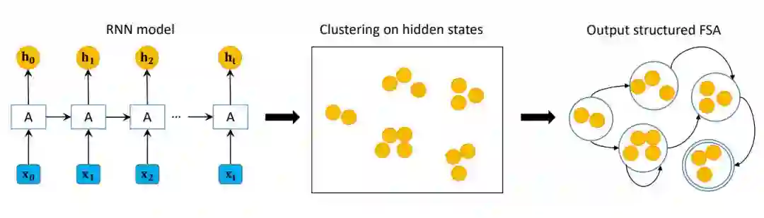 图 2:本文提出算法的框架展示。黄色圆圈表示隐藏状态,由 h_t 表示,这里 t 是时间步。「A」是循环单元,接收输入 x_t 和 h_t-1 并输出 h_t。结构化 FSA 的双圆圈是接受状态。总体来说,该框架由三个步骤构成,即训练 RN 你模型、聚类隐藏状态和输出结构化 FSA。