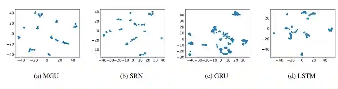 在这一部分,我们介绍提出方法的直觉来源和方法框架。我们将 RNN 的隐藏状态表示为一个向量或一个点。因此当多个序列被输入到 RNN 时,会积累大量的隐藏状态点,并且它们倾向于构成集群。为了验证该结论,我们展示了在 MGU、SRU、GRU 和 LSTM 上的隐藏状态点的分布,如图 1(a)到(d)所示。