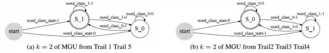 如表 2 所示,我们可以看到在从 MGU 学习到的 FSA 的平均集群数量总是能以最小的集群数量达到准确率 1.0。集群数量为 65 意味着 FSA 的准确率在直到 n_c 为 64 时都无法达到 1.0。每次试验的最小集群数量和平均最小集群数量加粗表示。