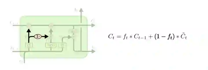 另外一种变体是使用couple forget 和 输入门限(input gates)。不是明确地把需要丢弃什么和需要添加新的信息分离开来, 而是把这些决策放在一起。我们仅仅丢弃当我们将要在当前位置输入时。我们仅仅输入新的值到我们已经忘记一些旧值上。
