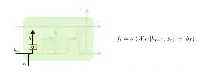 LSTM的第一步是决定我们要从细胞状态(cell state)中丢弃哪些信息。这个决定是由一个sigmoid层叫“忘记门限层”所决定的。它的输入为