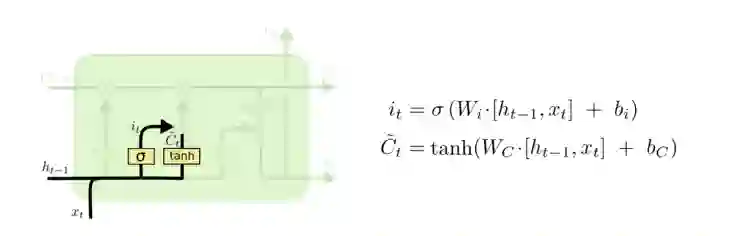 下一步就是决定哪些新的信息需要存储在细胞状态中。这包含两部分:第一部分,一个sigmoid层叫“输入门限层”决定哪些值我们需要去更新。第二部分,一个tanh层,创建一个新的候选向量