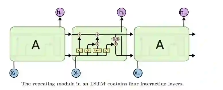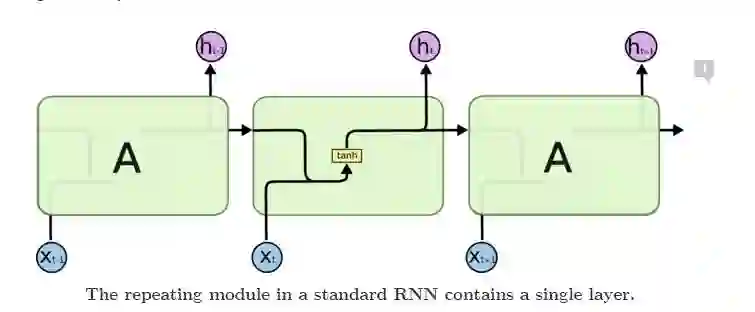 所有的递归神经网络都有重复神经网络模块的链式形式,在标准的RNNs中,重复模块只有一个非常简单的架构,比如只有一个tanh层