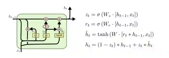 一种稍微变化大一点的LSTM变体是Gated Recurrent Unit, 或者GRU, 由 Cho, et al. (2014).提出来的,它组合了忘记和输入门到一个“update gate”。它也合并了细胞状态和隐含层状态。和做了一些其他的改变。他的这个模型比标准的LSTM模型更加的简单,也慢慢的流行起来了。