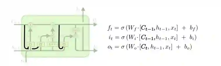 一种很流行的LSTM变体是由Gers & Schmidhuber (2000)所介绍,它增加了“peephole connections”, 也就是说,让门限层也接收细胞状态的输入。