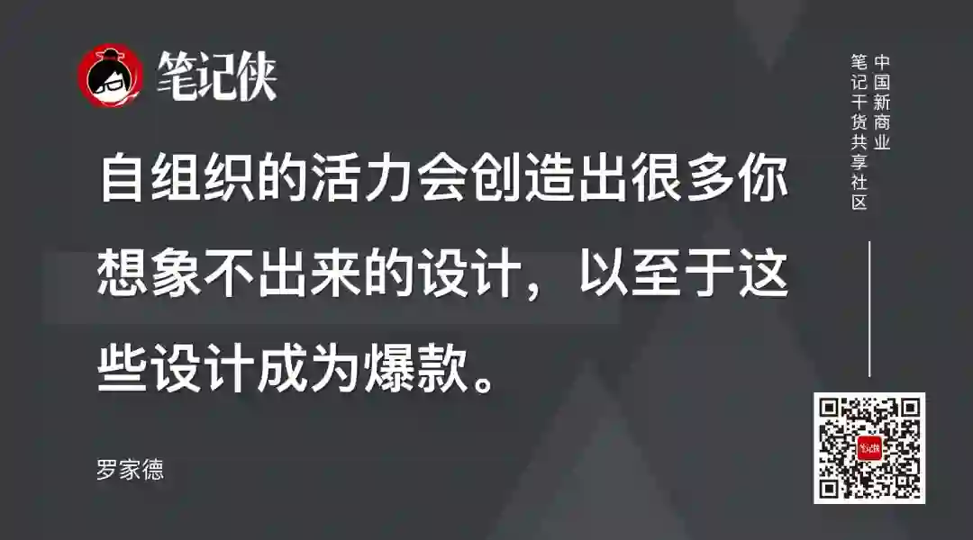 有很多类似的案例,腾讯的跑马制度,韩都衣舍等,都懂得利用整个系统中自发的创造力,自组织的活力会创造出很多你想象不出来的设计,以至于这些设计会成为爆款。