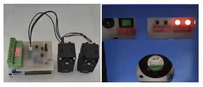 △(左)屏蔽罩和电机,(右)电源插座、电源开关、电机启动按钮、电机重置按钮、开发板状态 LED、电机状态 LED