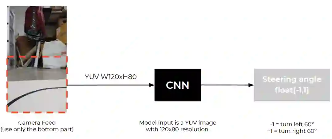 我们探索用于保持车道的多种模型 。作为基线,我们使用卷积神经网络 (CNN) 来检测每帧图像内的交通指示线,并以每帧为一个单位调整方向盘,这种方案效果良好。我们还通过添加了 LSTM 并使用前期拍摄的多个帧改进了方案。经过更多实验后,我们采用了与这篇论文类似的模型架构。