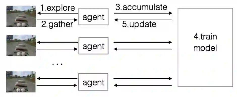 原因在于,多个agent同时探索,往往会探索到environment的不同状态。这样,在训练的时候,采样得到的训练数据之间相互的独立性会更强。所以分布式训练除了利用了更多计算资源以外,对RL而言对于训练时候的样本独立同分布还有额外的好处。文中提到的asynchronous advantage actor-critic, A3C算法是一个效果比较好的算法,值得感兴趣的同学关注一下。