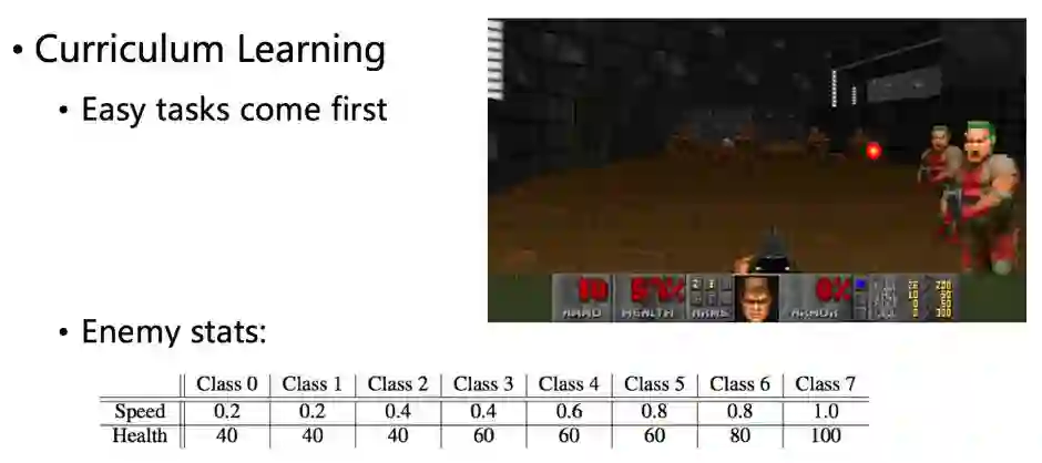 以上是个玩射击游戏的例子,不同的class 实际上是不同难度的同一个任务。Class 0是最容易的,意味着更容易收集到有意义的reward,所以训练起来比较容易;能顺利完成class 0的agent,相比未经训练的agent来说,在class 1里面收集到reward的难度要低,所以训练起来也比较容易,以此类推,就能逐渐完成我们最终设定的任务。