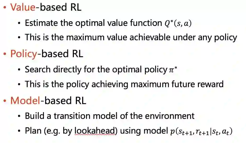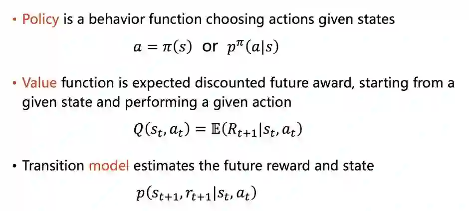 所以很显然,以上三者互相关联。如果能得到一个好的Policy function的话,那算法的目的已经达到了。如果能得到一个好的Value function的话,那么就可以在这个state下,选取value值高的那个action,自然也是一个较好的策略。如果能得到一个好的transition model的话,一方面,有可能可以通过这个transition model直接推演出最佳的策略;另一方面,也可以用来指导policy function或者valuefunction 的学习过程。