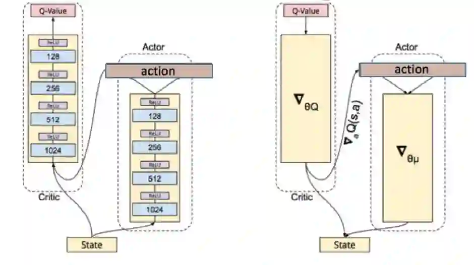 Q网络,即值函数部分,训练的更新依然通过通过TD loss 来更新; 网络,即策略函数部分,其更新的梯度方向为使得输出的action对应的Q值变大,也就是说,loss function为 -Q。具体证明过程在此不展开了。