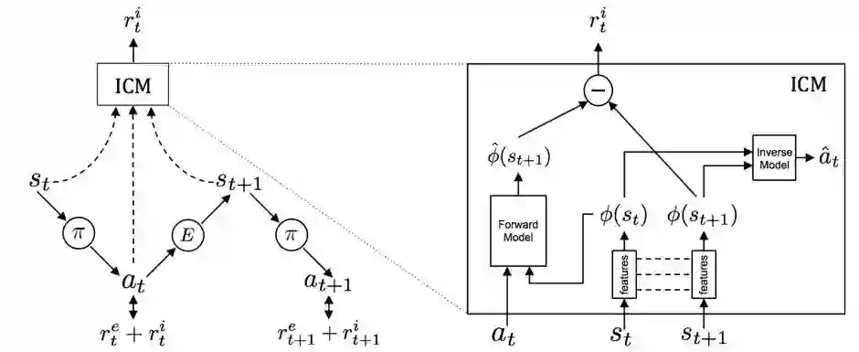 即构造一个专门的网络来预测环境的transition model;这个transition model跟着策略/值网络一起训练,只是以更慢的学习速度进行。那么这个transition model预测环境变化的准确度高的state,就认为agent已经很熟悉这个state了;反之,就认为这个agent对当前所处的环境不是很熟悉。所以,就是用transition model的training loss 来当做intrinsic reward。这个training loss的方法被形象地称为Curiosity Driven Exploration。