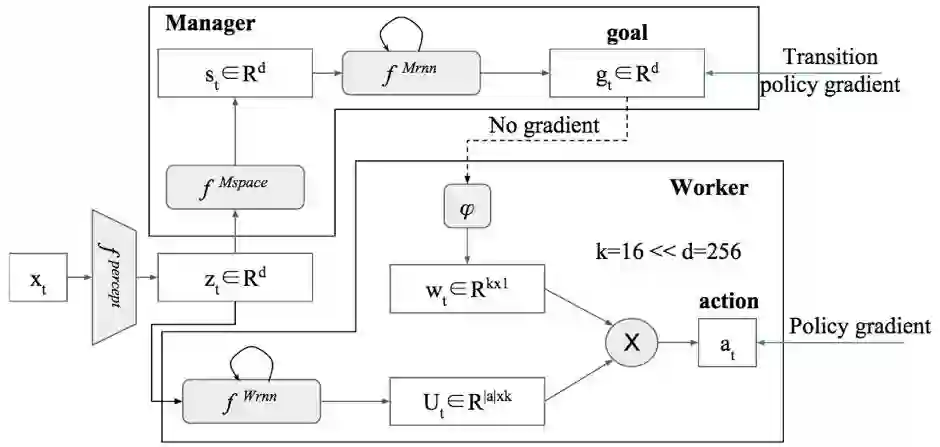 通常,Heirarchical RL会把策略分为至少两层,上层的策略负责输出底层策略的阶段性目标,称为goal或者option;然后底层策略在一定的时间周期内,负责实现这个目标。上层策略可以在此期间,负责输出reward给底层策略,用来评价底层策略的执行情况。属于这类的工作有很多,在此就不一一举例了。