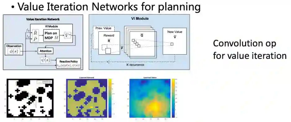Value Iteration Network这个工作的思路正是如此,其利用了Q值迭代过程和convolution/max pooling 过程形式上的一致性:二维平面状态空间下,假设每个状态只能转移到和其相邻的状态中,那么根据bellman equation对平面内所有状态做一次值迭代的过程,就可以表示成在这个二维图上的一次卷积操作。这样,通过若干轮卷积,网络可以提取出若干步后的所有状态的Q值,这种look ahead 的行为正是规划(planning)所需要的。
