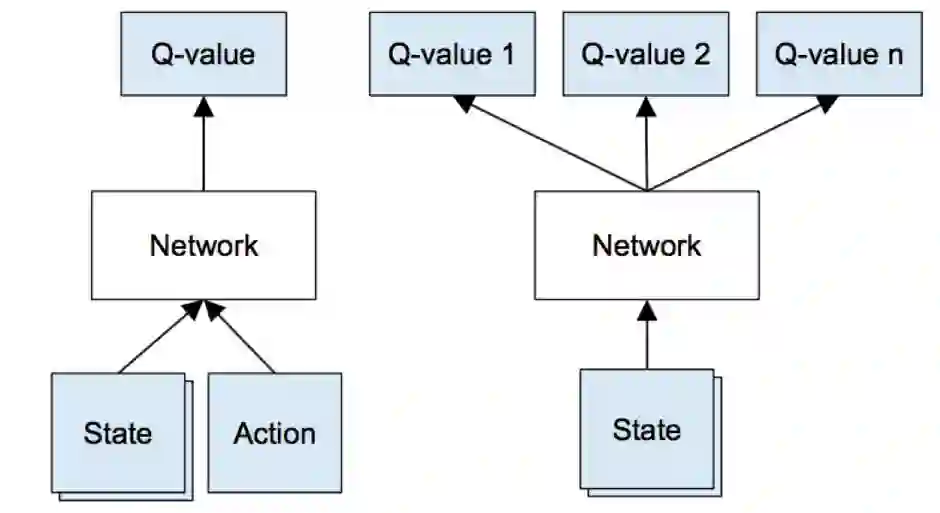 第一个问题是神经网络的计算代价较大,所以对函数的形式从上图左边所示调整为右边,一次计算就能得出这个state下所有action的Q值。