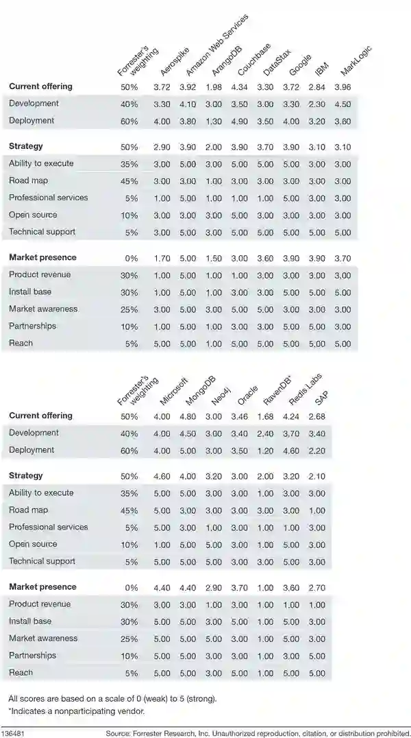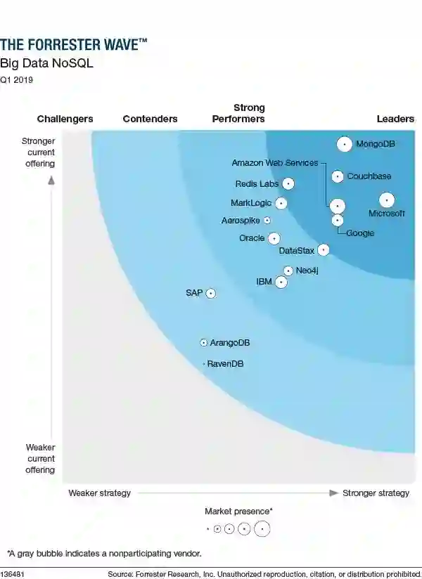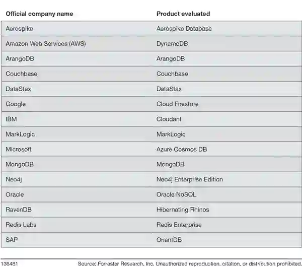 Forrester在该评估中介绍了15家供应商:Aerospike、AWS、Arango DB、Couchbase、DataStax、谷歌、IBM、MarkLogic、微软、MongoDB、Neo4j、Oracle、RavenDB、Redis Labs和SAP。