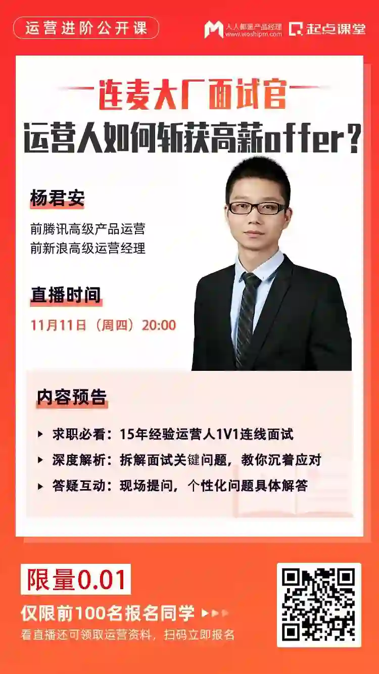 为此我们特别邀请了从事互联网运营15年+互联网运营经验,前腾讯高级产品运营@杨君安老师 担任面试官,在11月11日20:00点进行在线连麦模拟面试。
