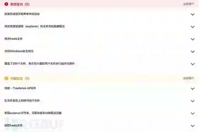 遍历磁盘,在磁盘根目录下创建autorun.inf文件,写入如下数据,尝试进行U盘感染,并且少不了的将此文件设置为隐藏