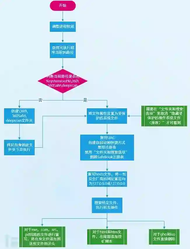 路径判断:样本会判断当前的执行路径是否在%systemroot%\360\360Safe\deepscan目录下,如果不在此目录下则拷贝自身到此目录并执行。如果在此路径下,将会首先进行一些修改系统设置相关的操作: