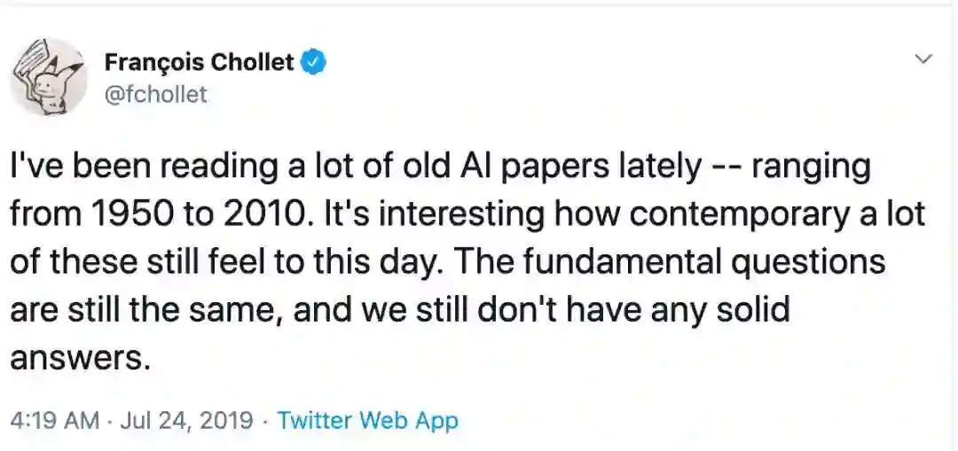 近期他发表了一条推文,称 “最近读了不少 1950 年到 2010 年 AI 相关的老论文。 有意思的是,很多东西都没过时,基本问题并没变,也没有得出确切的答案。”