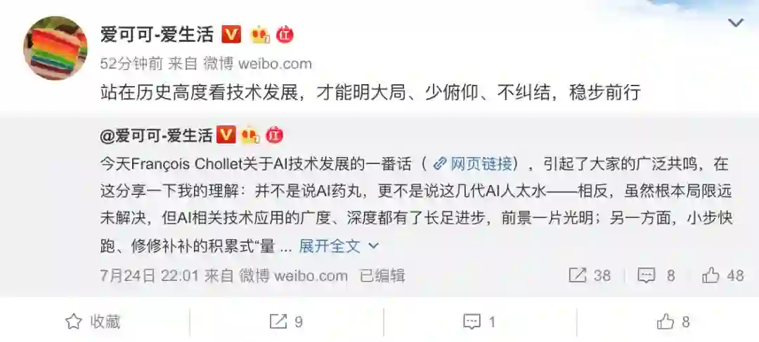 知名互联网资讯博主 @ 爱可可 - 爱生活也对此给出了自己的解读,他认为 Francois Chollet 的这番话并不是说 AI 药丸,更不是说这几代 AI 人太水。