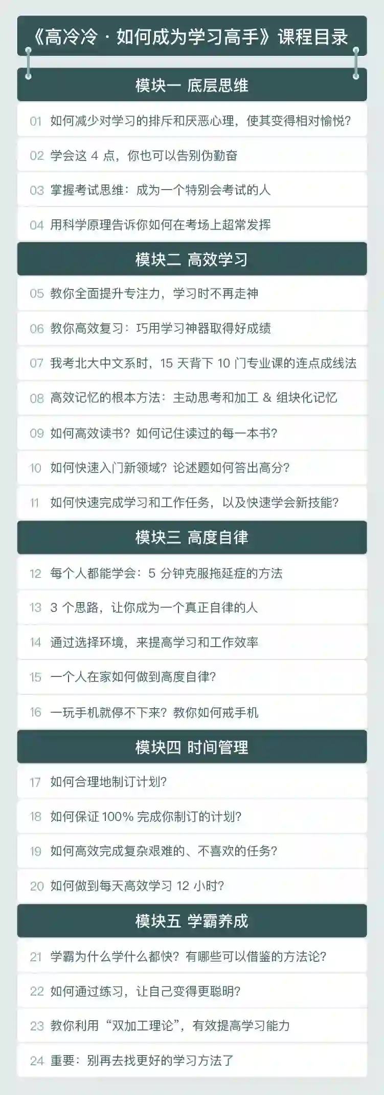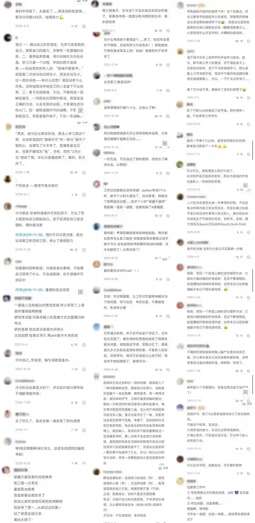 专栏通读下来,说 10 倍提升你的学习效率,毫不夸张。除了上面列的实用学习技巧,冷冷还把高手学习的 4 个底层思维、让学习速度“开挂”的高效记忆法、自律到骨子里的 9 大精力管理法则等,都毫无保留地分享出来,这种精神,很难得。