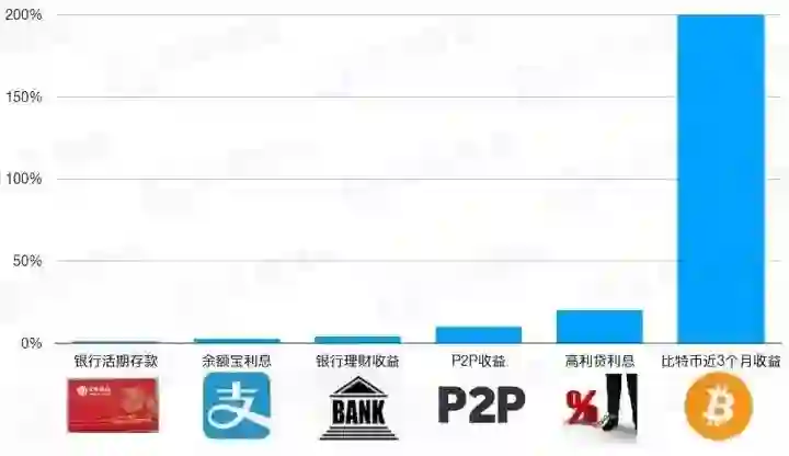 从 3 月份开始张超看到了比特币上涨的机会,如果他在 3 月份把买房的首付款 250000 块钱拿出来买下 10 个比特币,那么他现在的数字资产价值将达到 840000 元,这一收益远超 1.5% 的央行活期存款基准利率,远超蚂蚁金服余额宝 2.5% 的年化利率,远超银行理财产品 4-7% 的年化收益率,远超 P2P 10-15% 的年化收益率,远超高利贷 20-40% 的收益率。