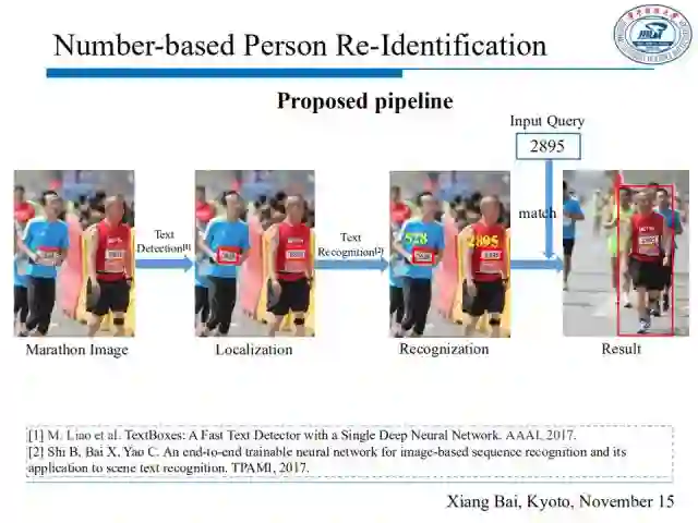 如图,我们提出的方法分为如下几个步骤:首先使用TextBoxes对输入图片进行文本检测,即定位出文本区域,然后通过CRNN进行文本识别,再将带搜索文本与识别出的文本库进行匹配,寻找到该数字文本对应的选手。
