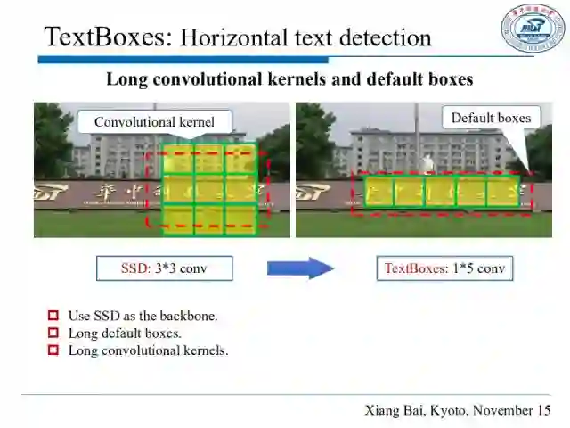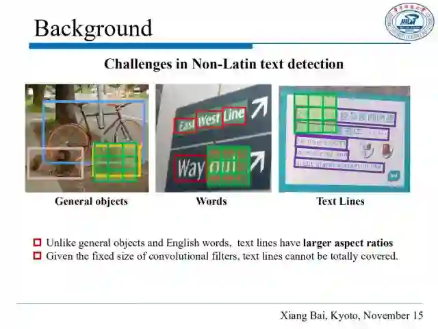 区别于普通的物体和英文单词,文本行具有更大的高宽比,对于普通的卷积核,文本行不能被完全覆盖。这意味着现有基于深度学习的目标检测方法并不能很好适用于场景文本检测。
