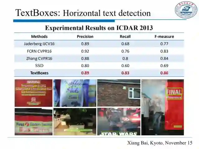 由上表可以看出,TextBoxes明显优于SSD并且在ICDAR2013数据集上达到了state-of-the-arts的效果,这个数据集主要由包含水平文本的图片构成。