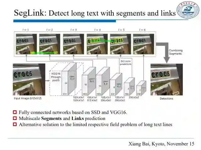 接下来介绍基于部件的方法SegLink,它的核心思想是将文本行分解成两种可检测的元素:定义为部件(segment)和关联(link)。部件是指文本行的一部分(图中黄色部分),关联是指连接两个相邻部件的联系(图中绿色短线),被关联表明其属于同一单词或者文本行。 基于segments和links,整个文本行可以通过一个简单的组合表达出来。因为Segments和Links不涉及感受野问题,所以这个思路可以处理长文本行。