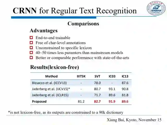 针对开放字典数据集,我们的方法在识别精度上达到了当时的state-of-the-arts。CRNN还具备以下优势:可以端到端训练;且不受字符标注的约束,这意味着我们可以直接输入文本行进行训练和测试;它没有字典集的限制,因此我们可以将其用于其他序列的识别,比如识别银行卡上的数字;在模型大小上,它比主流的模型参数减少了40~50倍,更有利于在工业实际场景中落地。