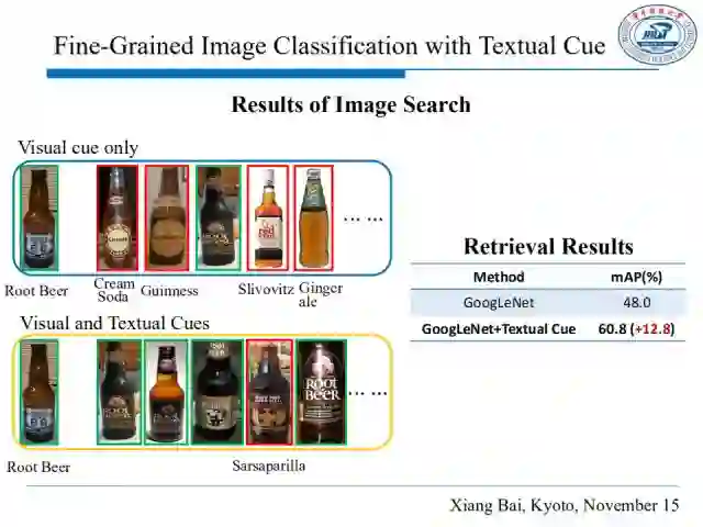 我们也将学习到的融合特征用于图像检索,如图,只用视觉信息可能会因为其差别过小引起误分类,而加入文本信息后,酒瓶图片检索的mAP提升了12.8%。