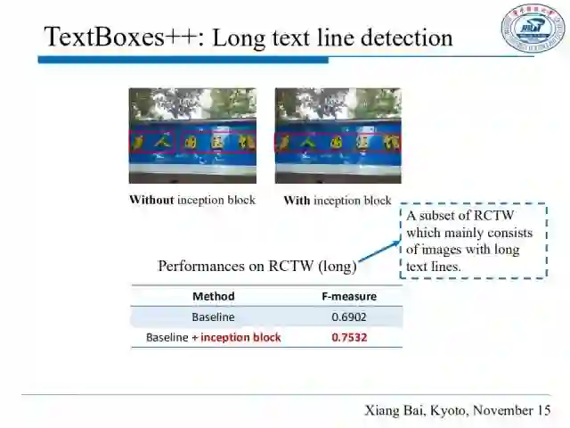 为了验证inception模块的有效性,我们在RCTW 2017的一个数据子集上进行测试,这个数据集主要包含一些长条形文本图片,结果表明inception 模块有效提高了长条文本检测准确率。