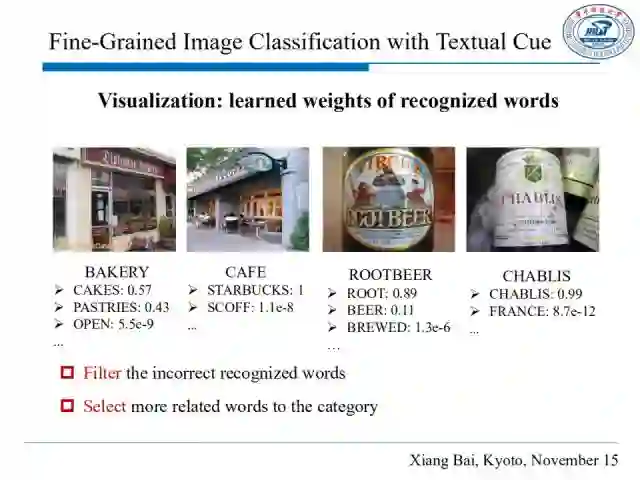通常,只用图片直观的视觉信息是不足以进行细粒度图像分类的,如上图,看上去(a)和(b)是类似的,而实际上,(b)和(c)描述的是同一场景,且与(a)大不相同。我们仔细观察,(b)(c)中分别包含了语义相近的词“cafe”和“coffee”,这其实可以在图片仅有微小视觉差异的情况下帮助我们进行细粒度的图片分类。