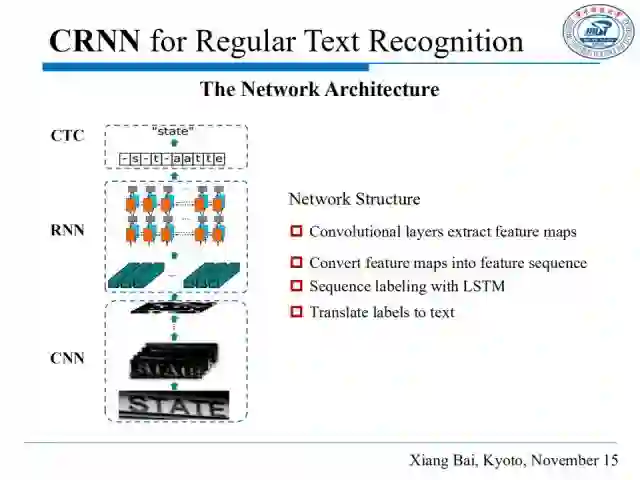 针对场景文字识别,这里主要讲述两个算法,针对整齐规则文本的CRNN模型,和针对不规则形文本的RARE模型。首先介绍CRNN: