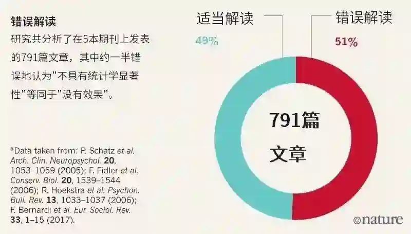 类似的错误非常普遍。根据对数百篇文章进行的调查,超过一半的“不具有统计学显著性”被解读为“无差异”或“无影响”(参见“错误解读”)。