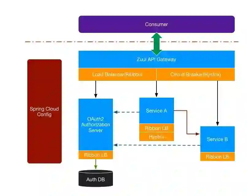 Zuul - Zuul 是在云平台上提供动态路由,监控,弹性,安全等边缘服务的框架。Zuul 相当于是设备和 Netflix 流应用的 Web 网站后端所有请求的前门。
