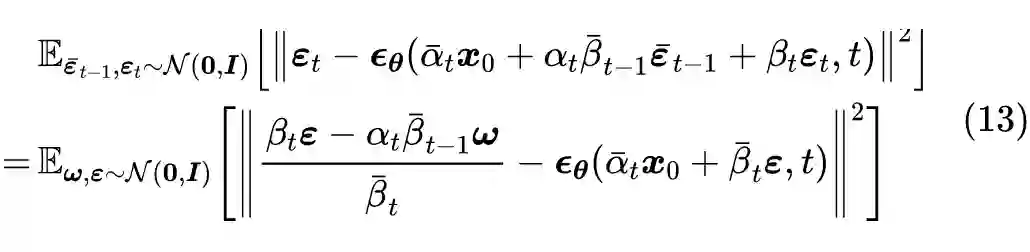 然后,我们利用一个概率论的知识——正态分布的叠加性,即上述多个独立的正态噪声之和的分布,实际上是均值为 0、方差为