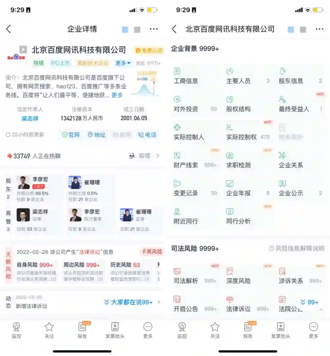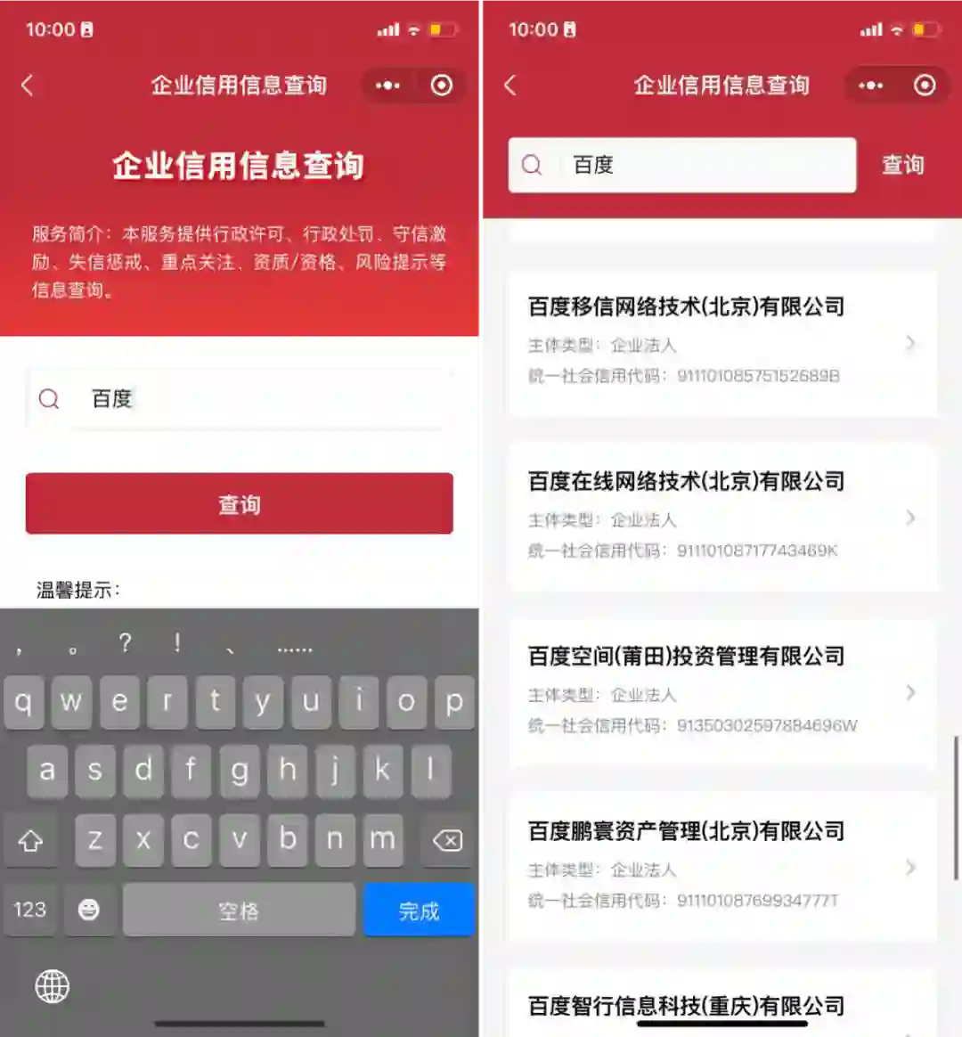 整体界面非常简洁,与搜索引擎一样,只有搜索框及相关提示。此时,我们只需要在搜索框中打出企业的大致名字,就能找到我们想要的信息。比如我们用百度在线网络技术(北京)有限公司来举例。我打出「百度」两个字,会出来一系列与百度相关的公司,这时候往下翻一下就能找到百度在线网络技术(北京)有限公司