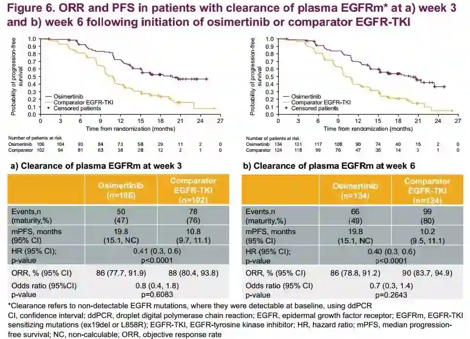 在总共556例患者中,499例患者血液ctDNA可评估(奥希替尼组:247/499例,49%;吉非替尼/厄洛替尼组:252/499例,51%)。基线时,奥希替尼组68%(171/247例)、吉非替尼/厄洛替尼组69%(181/252例)的患者ctDNA检测到EGFR敏感突变,并被纳入本次探索性分析中。第3/6周时,奥希替尼组98%(168/171例)、吉非替尼/厄洛替尼组96%(174/181例)的患者ctDNA清除可评估。