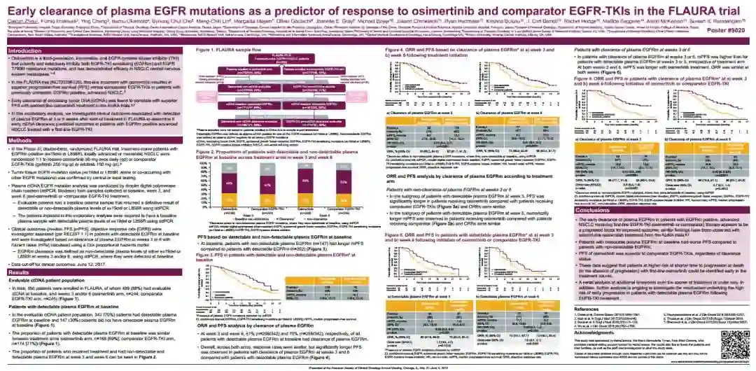Zhou CC,Imamura F,Cheng Y,et al.Early clearance of plasma EGFR mutations as a predictor of response to osimertinib and comparator EGFR-TKIs in the FLAURA trial[EB/OL].ASCO 2019,ABS:9020.