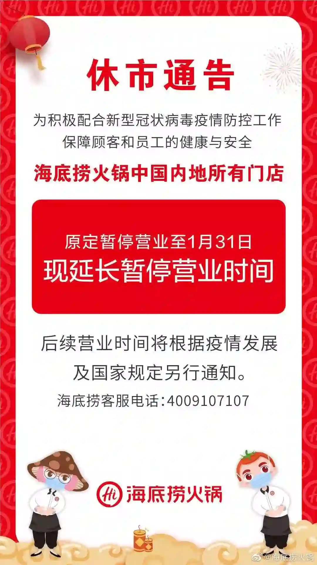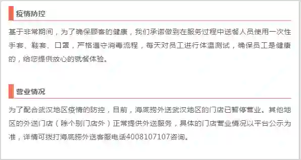 本以为海底捞还是打算用「老本行」来应对这次疫情,谁知 1 月 26 日,海底捞宣布全国休市,外卖「海捞送」也停止了服务。