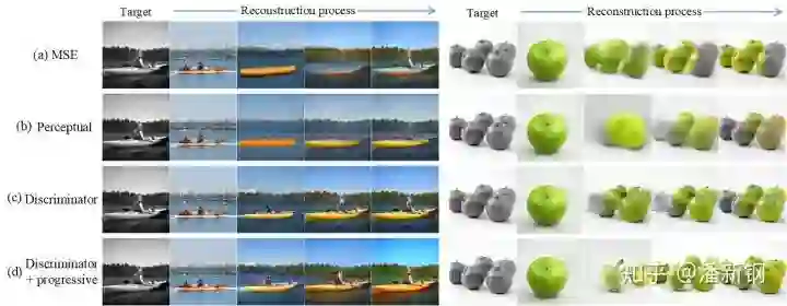 代表以x 作为输入时判别器第i个block输出的特征。从上图(c)可以看出,使用这种基于判别器的距离度量时,重建的过程更加自然和真实,最终颜色恢复的效果也更好。