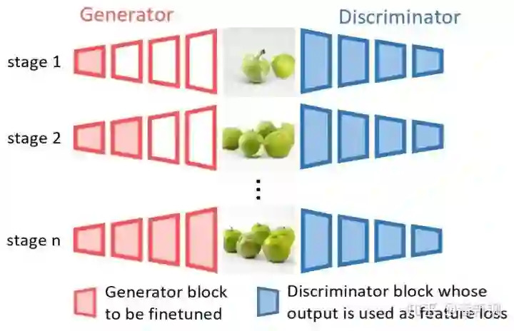 因此,我们在该工作中选择使用与该生成器对应的判别器 来作为距离度量。与Perceptual loss所采用的VGGNet不同,判别器并非在一个第三方的任务上训练,而是在预训练时就与生成器高度耦合,它天然地适用于调整生成器的输出分布。我们用判别器特征空间的L1距离作为距离度量,即