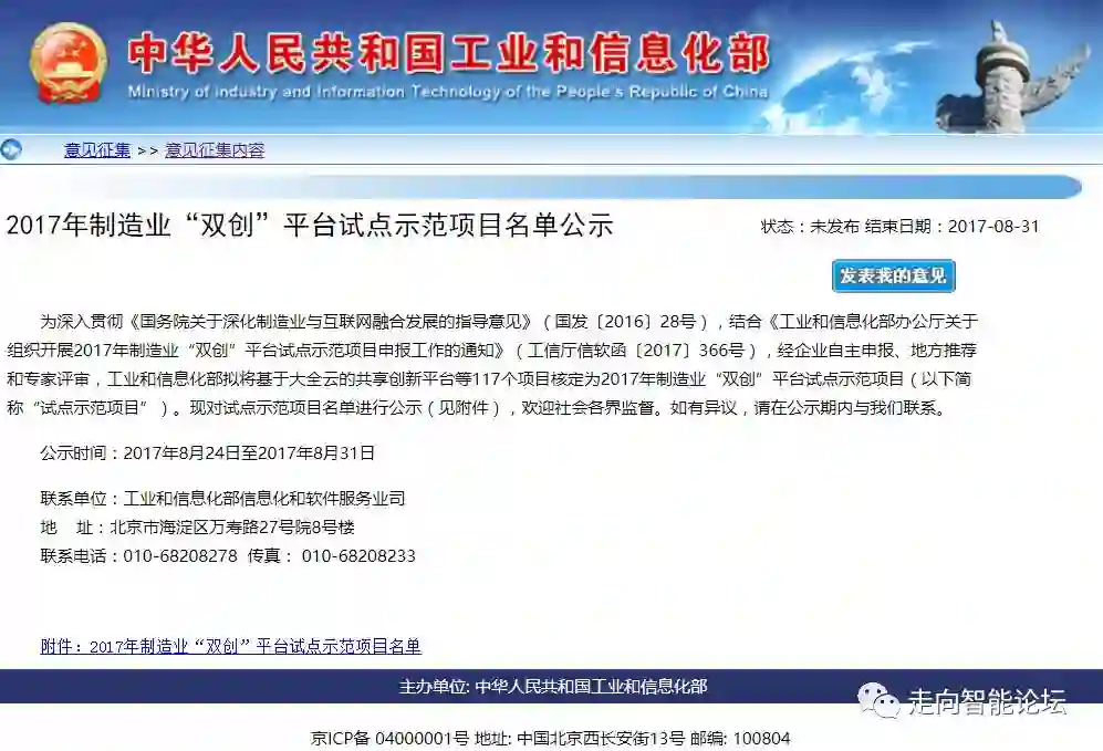 近日,工信部官网公示2017年制造业“双创”平台试点示范项目名单,并征集意见。本文来自:工信部官网,由《走向智能论坛》微信公众号推荐阅读。