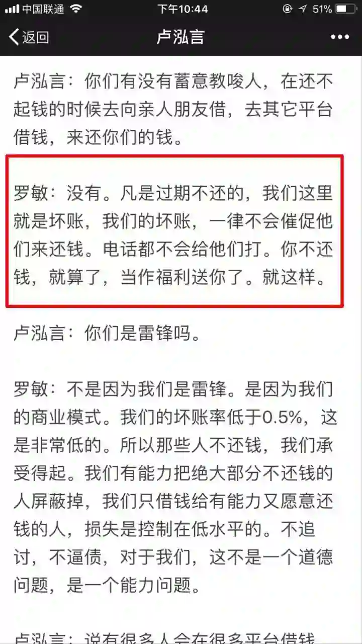 罗敏说,凡是在趣店逾期不还的贷款,直接作为坏账处理,不会进行追讨,直接送了。
