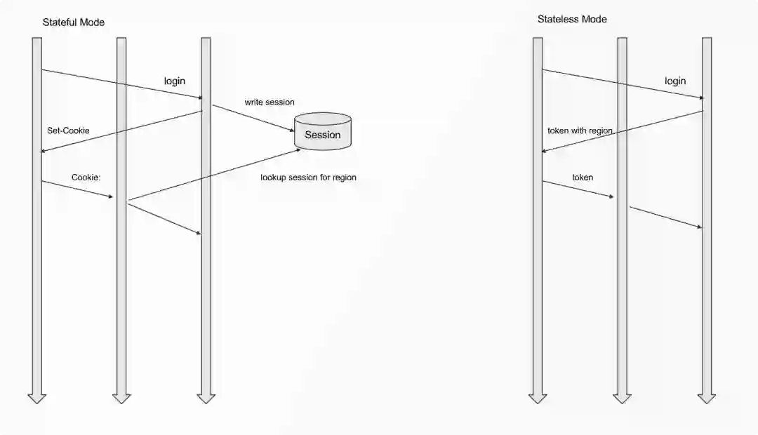 有状态模式一般会利用 Session(如上图左侧),客户端登录完成后 Sever 会将附带 Session ID 的 Cookie 给到客户端。在请求时,基于 Apache APISIX 实现的网关层会使用 Cookie 中的信息查询用户所处的地区。即便用户更换了服务器,依然可以保持登录状态,系统也可以判定从哪里获取数据。